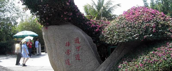 沿石径前走几十米,又到一片状物肖形的石群,每处古来就起了名字,有“鉴真沐海”、“仙桃石”、“交欢石”、“飞来石”……细细观赏,趣味无穷。沿“小洞天”西北面的崎岖山路攀登援而上,至半山腰,于万绿丛中,一块气势非凡的刻有“海山奇观”四个遵劲大字和游记是古崖州郡守毛奎所书,人登岩上,环顾四面,顿觉得“海光常潋丰,山色更清妍”山上,还有“试剑峰”等景观。观赏内容极其丰富,据多处石刻文字,提及鳌山下海边的“大洞天”一景,“犹奇绝而深秘”。